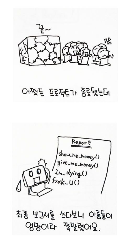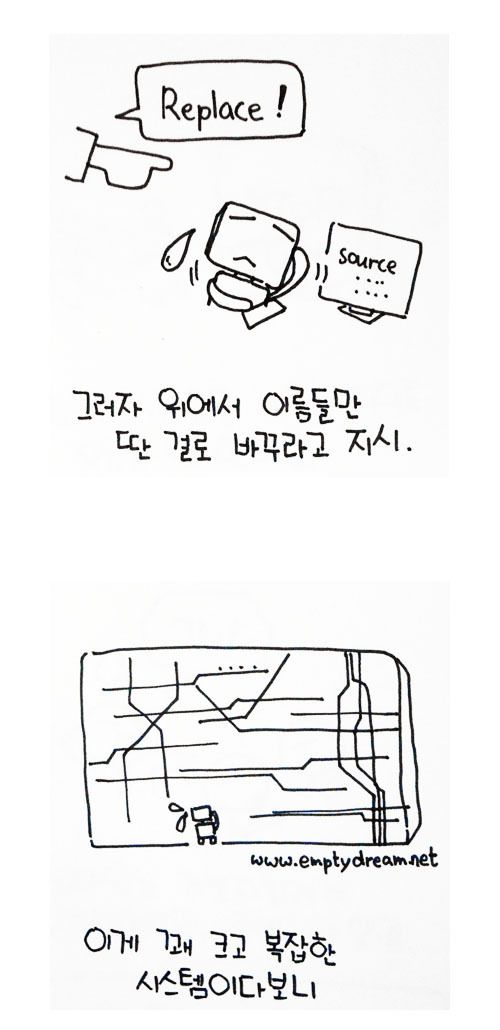 * 가끔 엉망인 프로젝트 투입되면 주석 읽는 재미도 쏠쏠함. 주석에 여태까지 당했던 내역을 일지로 적어놓은 사람도 있음. 하지만 그런 거 보려고 엉망인 프로젝트 투입되지는 말기 바람.