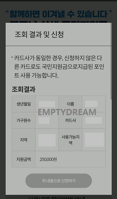국민지원금 조회 결과 신청 화면 이렇게 조회결과 화면에 이름, 생년월일, 카드사, 지역, 사용가능지역, 지원금액 등이 적혀 나온다.