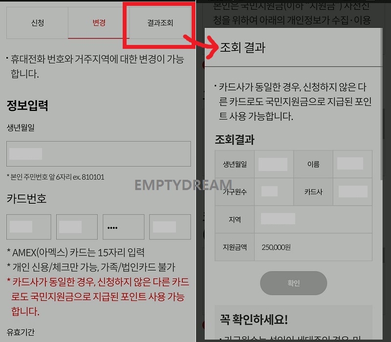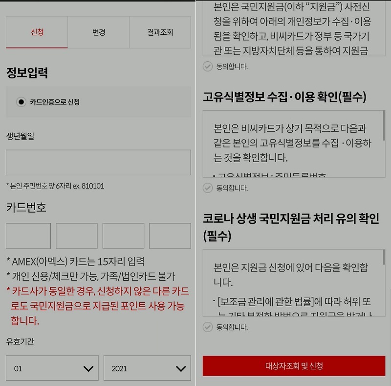 여기서 카드번호와 유효기간은 지원금을 입금 받을 카드로 입력한다.