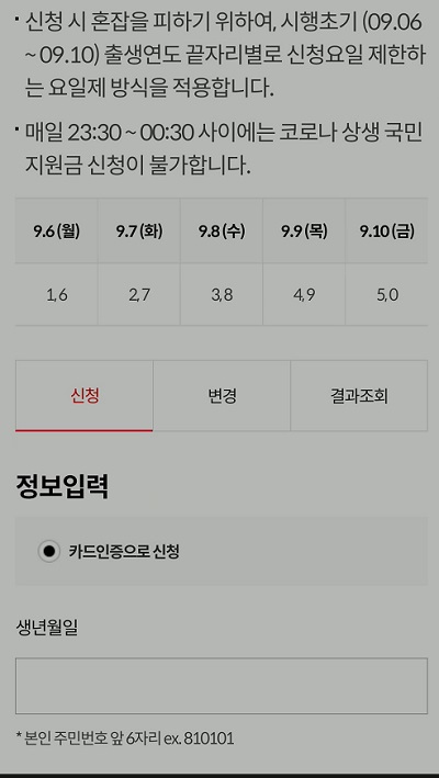 지원금 시행 첫 주에는 요일별로 주민번호 끝자리에 맞는 사람들만 신청 가능하도록 해놨다.