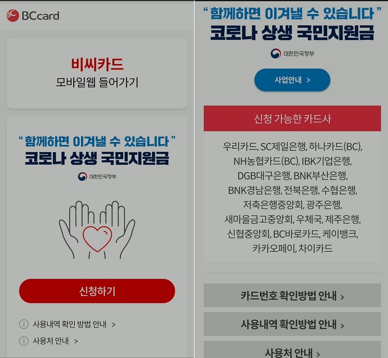 비씨카드 국민지원금 신청 페이지 주소는 아래와 같다.