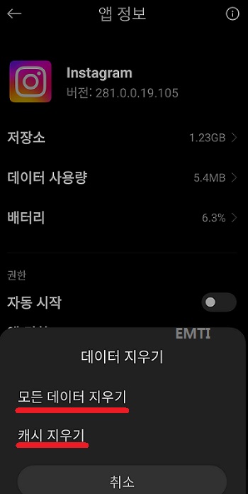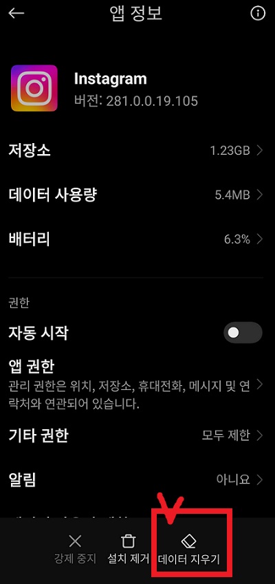 인스타그램 앱 정보 화면 위 이미지 처럼 '인스타그램 앱 정보 화면'으로 들어가는 것이 핵심이다. 여기서 화면 아래에 있는 '데이터 지우기' 버튼을 누른다. 그러면 아래 화면과 같이 어떤 데이터를 삭제할 것인지 묻는 창이 나온다.