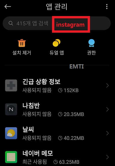 안드로이드 폰 앱 관리 화면 위 화면에서 스크롤을 올리면서 '인스타그램 Instagram' 앱을 찾아도 되는데, 너무 많아서 아마 찾기 힘들 테다. 그러니까 맨 위의 검색창에서 'Instagram'을 쳐서 어플을 찾는 것이 더 편하다.
