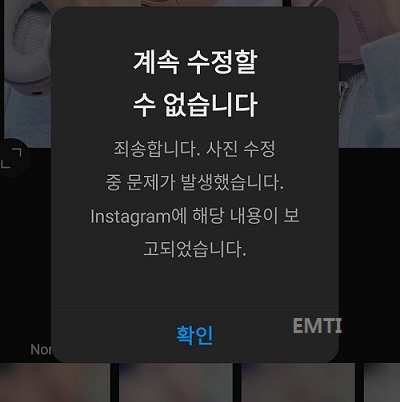 인스타그램에서 사진이나 동영상을 올리려고 할 때, "계속 수정할 수 없습니다"라는 에러 메시지가 나올 때가 있다. 혹은 "사진 수정 중 문제가 발생했습니다"라는 메시지가 나오기도 하는데, 어쨌든 이런 에러 메시지가 나오면 업로드가 계속 진행되지 않고 다시 이전 화면으로 돌아간다.