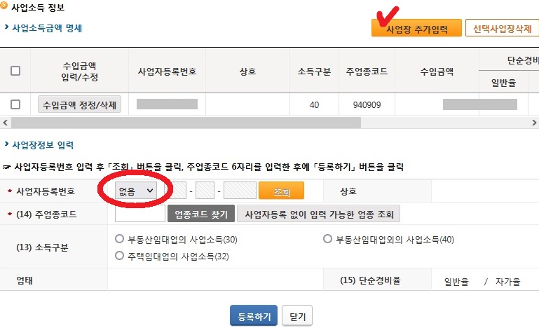 이후에는 사업소득 정보를 등록하는 항목이다.