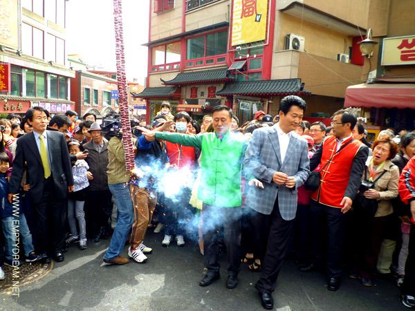 폭축이 다 터지고 나자, 약간 자리를 옮겨서 '스카이 힐' 입구 앞쪽 길거리에서 본격적인 길거리 행사가 펼쳐졌다. 북을 치던 사람들이 뒤로 물러서고 무술 시범으로 이어졌다. 화려한 동작과 절도 있는 몸놀림에 사람들의 감탄사와 박수갈채가 쏟아졌다.