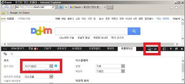 여기서 문서모드 등을 이용하면 IE10, 9, 8, 7 버전을 이용해서 화면을 보는 것 처럼 볼 수 있다. 하지만 완벽한 호환은 되지 않는다.