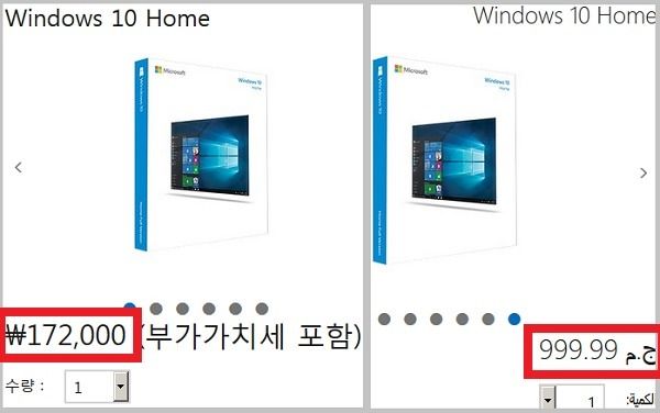 'Windows 10 Home'의 한국 가격은 172,000원이고, 이집트 가격은 999.99 파운드다.