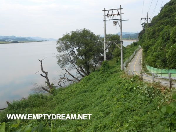 낙단보 지나서 길을 조금 잘 못 탔더니 국도로 가게 됐다. 가드레일 바깥쪽으로 자전거 길이 있는게 보이는데, 그 길로 갈 수가 없었다. 마음 같아서는 자전거를 들고 가드레일을 넘고 싶었지만, 그걸 넘으면 조금 깊어보이는 수렁(?)을 또 지나야 자전거길로 넘어갈 수 있었다.
