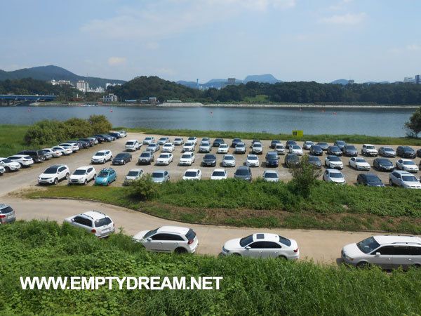 자동차 공장이라고 해도 믿을 만큼 많은 차들이 있는 주차장. 강 가의 저 좋은 땅을 주차장으로 활용하고 있다. 이건 일부만 찍은 사진이고, 옆쪽으로 더 길게 주차장이 이어진다. 정말 넓다.