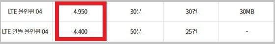 그나마 쓸만 한 것은 'LTE 올인원 04', 'LTE 알뜰 올인원 04'.