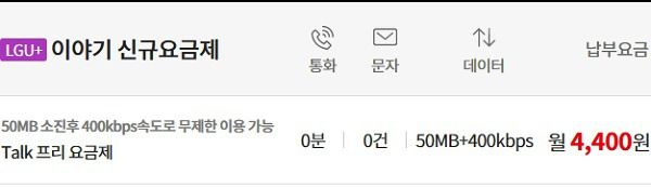 이야기 알뜰폰의 'Talk 프리 요금제'는 통화, 문자는 아무것도 안 주지만, 데이터가 매력적이다. 부가세 포함 월 4400원에 데이터 50MB. 그런데 50메가를 넘어가면 400kbps 속도로 무제한이다.