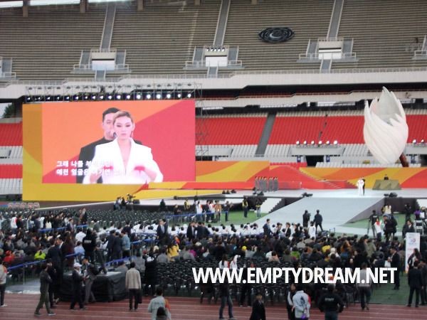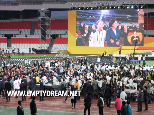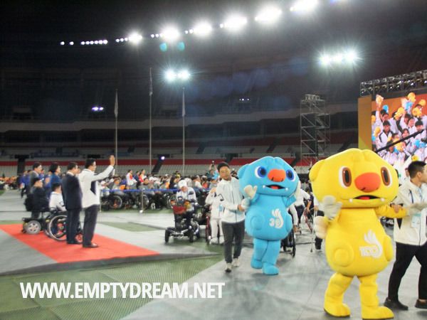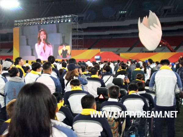 손을 흔들며 환영합니다라며 반갑게 맞아주는 자원봉사자들 사이를 지나서 올림픽 주경기장 안으로 들어갔다. 다소 일찍 들어가서 자리에 잠시 앉아 있었는데, 시작 시간 전까지 끊임없이 사람들이 밀려 들어왔다. 이번 개회식에는 장애인 선수단과 가족, 그리고 서울시민 등이 1만 5천여 명 참석했다.