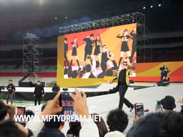 싸이는 두 번의 앵콜을 받으며 챔피언, WE ARE THE ONE, 강남스타일 등을 공연했다. 그는 이번 공연을 재능기부로 했다고 알려져 있는데, 사람들도 그걸 알아서인지 두 번 앵콜 후에는 더 잡아두지 못 하고 조용히 그를 보내줬다. 너무 순순히 보내줘서 좀 안타까울 지경이었다.