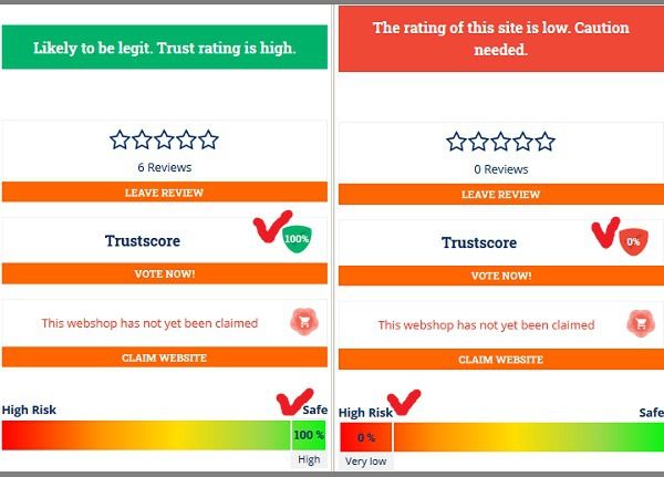 왼쪽은 제대로 된 쇼핑몰이다. 초록색으로 신뢰지수가 높다고 나오고, 아래에는 신뢰점수와 안전한지 여부가 표시된다.